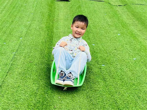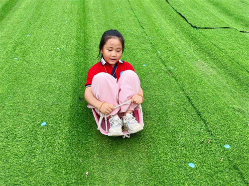 小山坡是孩子们喜爱的户外游戏场地之一,坐上滑草板,体验滑草的速度与快乐,小朋友们爬上滑下,乐此不疲。
