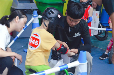 安全防护不能少,家长们为小骑士带上护具,老师们也在为平衡车做最后的安全检查。